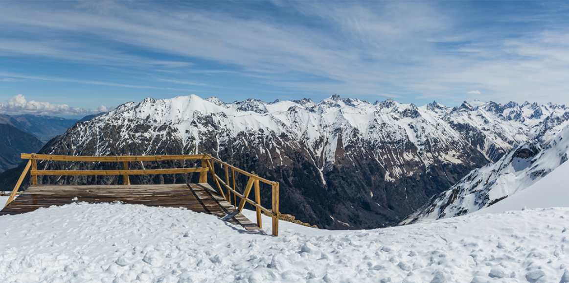 10:00 — Первая остановка: у подножия горы Чегет (поляна Чегет). Здесь предусмотрен подъем по канатным дорогам: